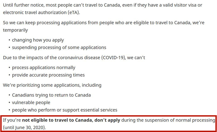 2020年6月8日,加拿大更新了疫情下的入境规定,虽然有条件放开了公民及永久居民直系亲属的入境限制,但是“非必要的旅行”仍被禁止,境外的签证审理继续被推迟到6月30日。移民局现在只会处理有资格进入加拿大的人的申请,但是由于疫情的原因,目前没有准确的处理时间,能够被优先考虑的申请只有: