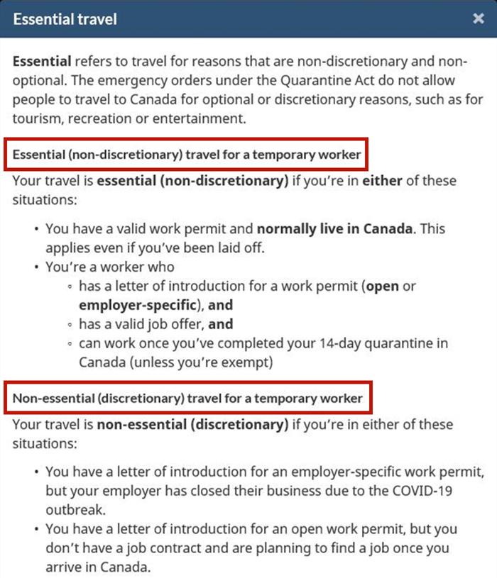 以下情况属于非必要旅行的外国工人,暂时不能入境加拿大,包括: