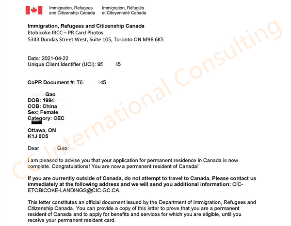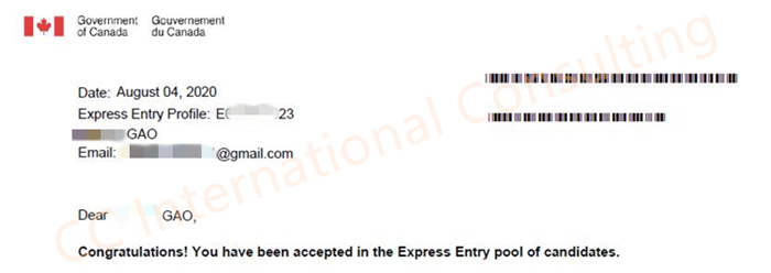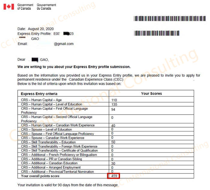 2020年因受疫情影响,安省硕士移民项目迟迟未开放,申请人工作满一年后即入EE池中,分数459分;入池两周后即获得联邦CEC移民邀请。