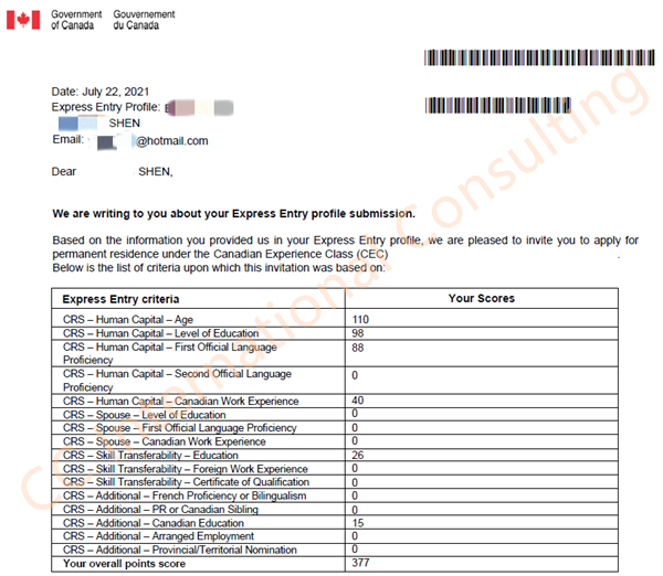 2021.07.22 获得联邦CEC移民邀请: