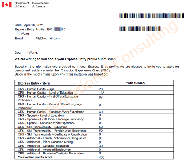 申请人在3月份首次入池时,用上了国内的工作经验,分数为430分,入池一个月后获得联邦邀请;但在此之前我们看到CEC的邀请分数在持续下降中,为了避免国内工作证明材料的麻烦,同时为申请人仅以加拿大工作经验二次入池,分数为380分。