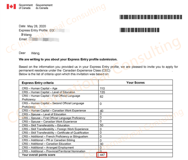 申请人其实已经预定了7月份回国机票,准备回国刷雅思或再积累1年国内工作经验以提高EE分数。受疫情影响,联邦快速通道持续降分,本来5月14日已经达到了联邦的447分邀请线,但是因为入池时间被卡掉,直到5月28日EE邀请再次降分至440分而获得邀请!