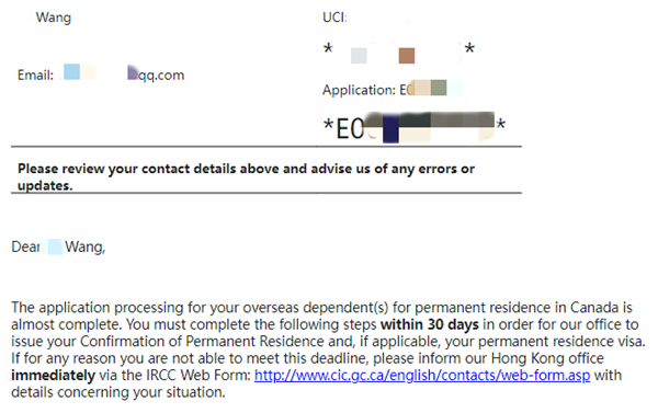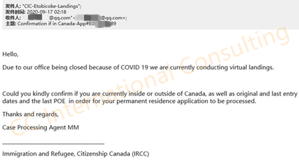 2020.09.17 收到移民登陆前的问询邮件,正常情况下人在加拿大境内会马上获批并免登陆程序(疫情期间)。但因申请人于7月份已回中国,所以在如实回复移民局邮件之后,移民审批被搁置(因加拿大疫情期间旅行限制令,境外PR申请人无法入境登陆):