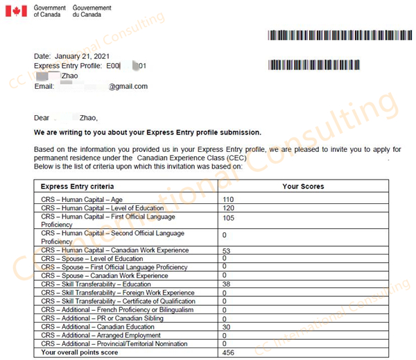 申请人入池时456分,因为错过2020年疫情期间的低分邀请期,所以开始准备申请LMIA来增加分数。在2021年准备递交LMIA申请之前,EE再次开启降分邀请,于1月21日邀请分数为454分时获得联邦移民邀请。