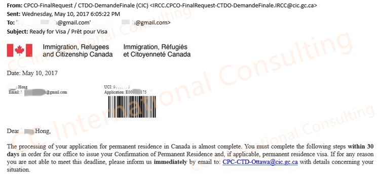 2017.05.10 移民申请获批,通知寄护照贴签:
