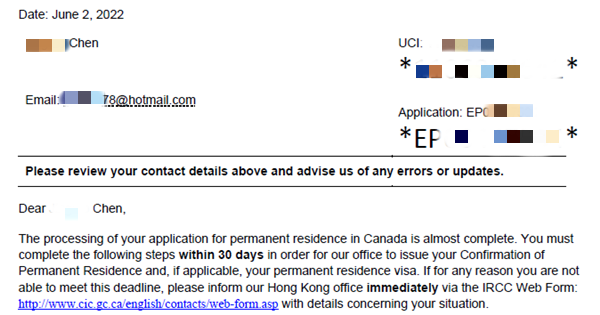 2022.06.02 移民获批,收到寄护照贴签通知: