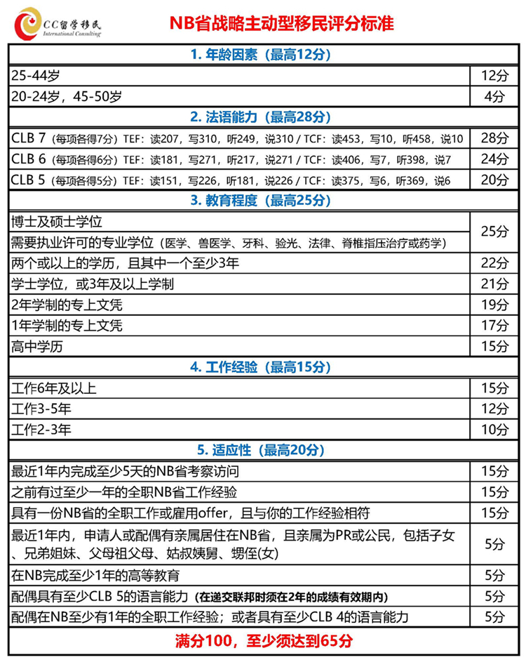 CC移民认为NB省新推出的这个移民项目属于不需要雇主的技术移民类别,与其他的NB省提名移民项目不同,该项目没有强制要求NB省的工作经验或教育背景,也没有强制性的语言要求。该项目突出的是定居NB省的意愿,以及法语的加分优势,整体来讲申请门槛并不高。