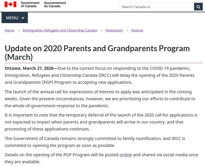 加拿大父母担保移民受疫情影响被推迟Published by ccic on 2020-03-272020-03-273月27日,加拿大联邦移民部发布通知,受新冠病毒疫情的影响,2020年的父母及祖父母团聚移民项目被推迟。应在未来几周内的担保意向征集活动,也暂时搁置。 Views: 1,640 Categories: 最新移民动态