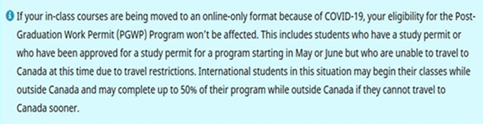1. 在境外开始网课的国际学生,如果不能更早地前往加拿大,那么可以在境外完成最多50%的课程。(注意,言外之意如果在境外完成的网课部分超过了Program总课时的50%以上,则未来有可能失去申请毕业工签的资格。)