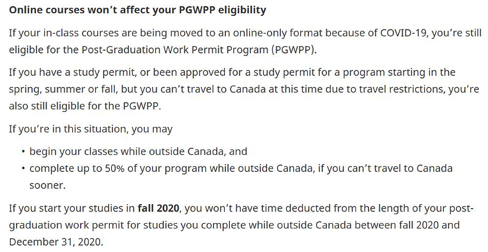 鉴于疫情的影响,加拿大移民部允许国际留学生的2020年秋季学年,可以在加拿大境外完成最多50%的线上课程,之后返回加拿大境内完成全部课程以后仍可获得毕业工签。并且2020年秋季开学至2020年12月31日期间,在加拿大境外的学习时间不会在毕业工签的有效期中减除。