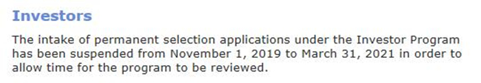 魁北克决定继续关闭投资移民项目PIIQ。该项目去年10月底被叫停,原定于今年7月1日重新开放,但魁省移民局5月20日宣布把开放日期延迟至2021年4月1日: