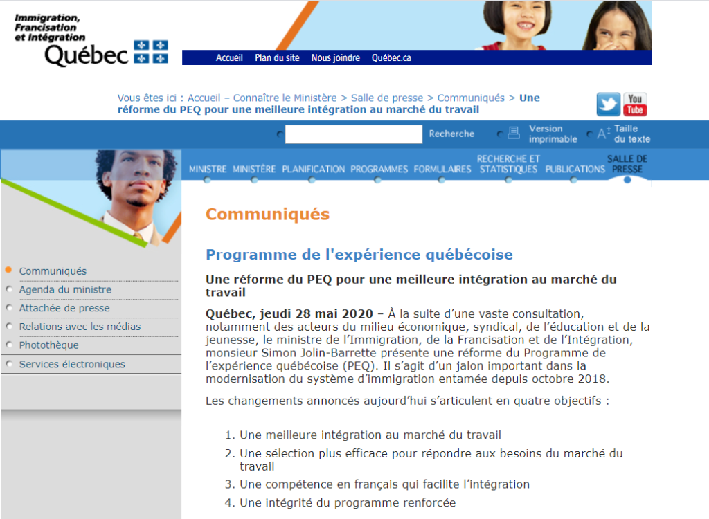 5月28日上午11点30分,魁北克移民部长Simon Jolin-Barrette召开新闻发布会,公布了PEQ新政措施,之后魁北克移民局官网也做了更新,主要内容如下: