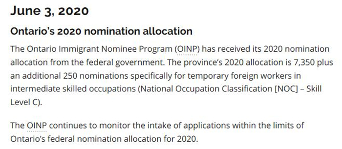 6月3日,安省发布2020年联邦分配的省提名配额情况。