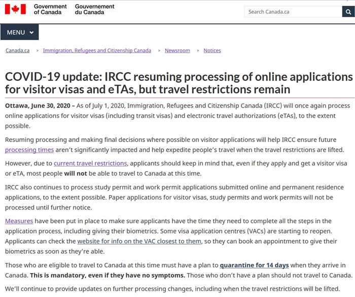 加拿大联邦移民部将继续更新处理变化的信息,包括旅行限制何时解除。