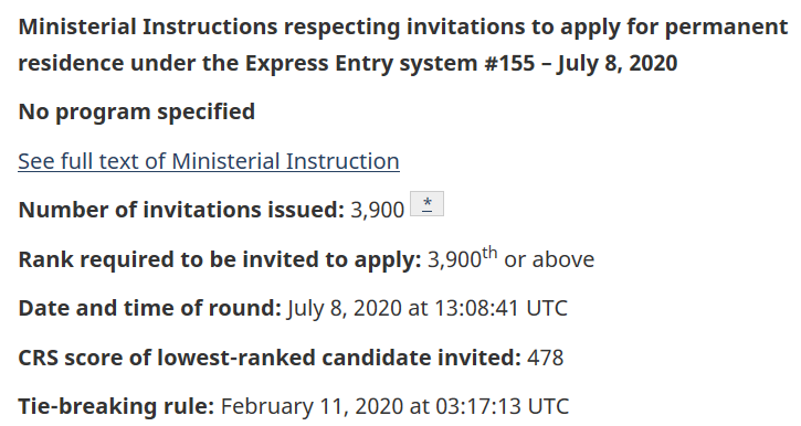 7月8日,加拿大移民部进行快速通道EE的第155次移民邀请,这次是不分移民类别的邀请,共计发出邀请3900份,邀请分数为478分。