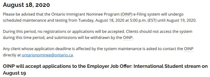 在前一天,8月18日安省在其官网提前通知了次日开放的通知:安省省提名雇主担保移民国际留学生类别,将于加拿大东部标准时间2020年8月19日上午9点至下午5点开放申请。