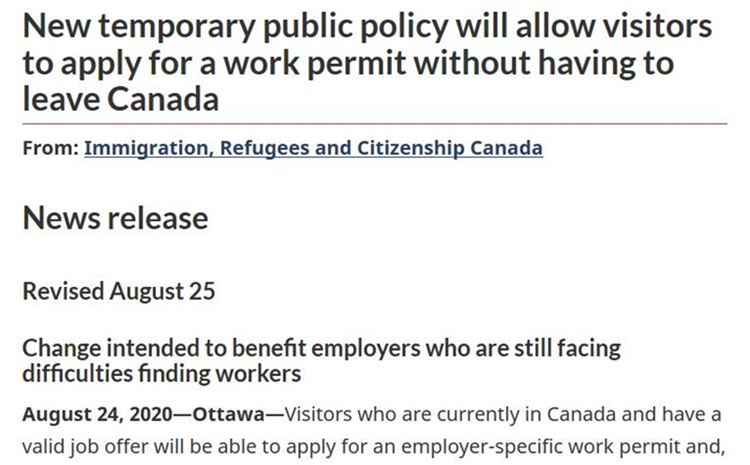 8月24日、25日两天,加拿大联邦移民部连续更新境内申请工作签证的政策,有改变也有创新,目的都是为了促进复工,使那些面临找不到工人的雇主受益【都不工作在家躺着数政府救济金呢,雇主当然找不到工人了!】