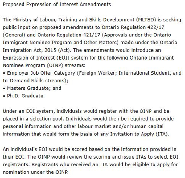 OINP于9月8日宣布,安省省提名项目将采用EOI评分筛选系统,来取代抢名额的申请方式,政策公示期为45天,于10月23日结束公众咨询期。目前安省省提名移民项目中涉及抢名额的有安省硕士移民项目、安省雇主担保移民外国工人类别和安省雇主担保移民留学生类别。