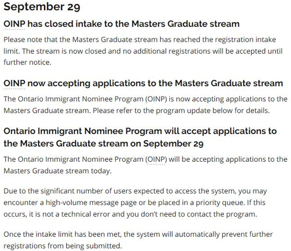 9月29日,安省硕士移民项目突然开放接受申请,大约半小时后关闭。这是今年首次开放该移民项目,应该也是唯一的一次了。此次安省共接受1215份的注册申请,但实际应该1000也不到,因为许多人都是委托他人一起抢名额,而且同一个申请人被两人以上同时抢到的情况很多,仅我公司客人中就有三位客人即是如此(我公司此次共有8位客人抢到名额)。