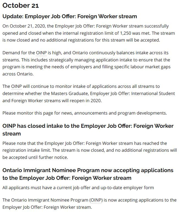 10月21日,安省雇主担保移民外国工人类别再次开放,此次或为明年改为EOI申请方式前的最后一次抢名额方式,在9月29日的时候,安省硕士移民项目也曾最后疯狂了一次,所以预计在年底年初,雇主担保留学生类别也会有最后一次机会抢名额。