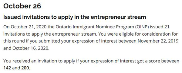 10月26日,安省企业家移民项目发出21份移民邀请,邀请分数为142分。