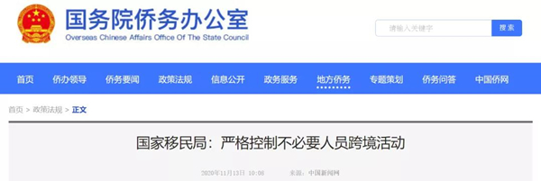 11月12日,中国国家移民局副局长尹成基表示,根据近期国际疫情形势,国家移民管理局把外防输入作为当前工作的重中之重。将从严审批中国公民旅游等非必要事由的出入境证件申请,劝阻和限制内地居民旅游、探亲、访友等非必要、非急需出入境活动。