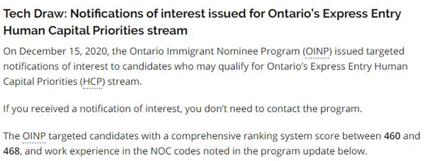 12月15日,安省优才移民类别发出新一轮的移民邀请,本次还是Tech Draw,只针对ICT的6个工作职位发出邀请,分数再次下降2分,本次邀请分数为460分,共计发出移民邀请668份。