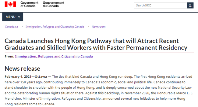 2021年2月4日,联邦移民部发布了针对香港年轻人的移民政策更新。