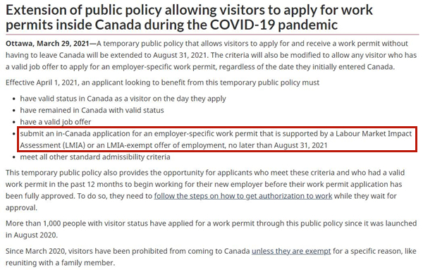 加拿大访客境内申工签政策延续到8月31日Published by ccic on 2021-03-292021-03-293月29日,联邦移民部延长了关于“访客在加拿大境内直接申请工签”的政策: 去年8月,为了应对新冠疫情的影响,加拿大出台了临时政策:已在境内的访客(包括旅游、探亲、陪读),如果持有有效的LMIA,可以无需出境直接在境内申请工作签证。 当时该临时政策的有效期至2021年3月31日【详细内容点击阅读】,现在临近到期日,移民部将该政策延续到2021年8月31日。 Views: 2,160 Categories: 最新移民动态