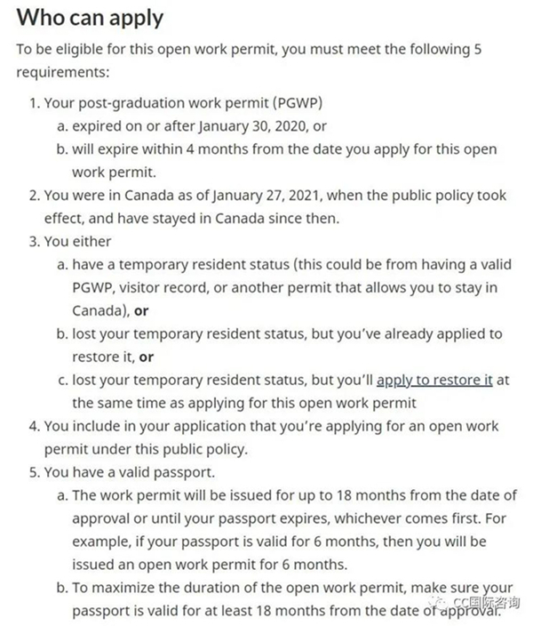 2021年127日开始,在加拿大境内的国际毕业生,符合一定的要求即可申请毕业工签之外的18个月open work permit,该项政策将于2021727日期满结束