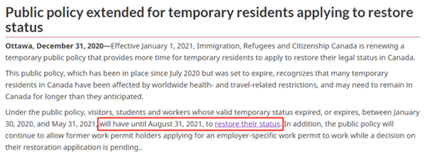 加拿大移民局于20201231日更新了临时公共政策,允许身份过期的境内临时居民在更长的时间期限内申请恢复身份,与此同时,你可以留在加拿大。即:凡是有效身份在2020130日至2021531日期间过期的持旅签、学生和工签的人士,都可以2021831日之前恢复为合法的访客身份