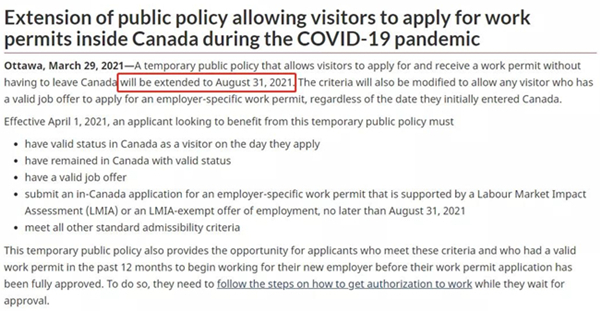 去年加拿大政府为了解决疫情期间劳动力短缺的问题,允许持有有效Job Offer的境内访客(即持旅行签证人士)在加拿大境内直接申请封闭工签,而正常时期这类人群必须在境外申请才行。这项临时政策也将于2021831日关闭