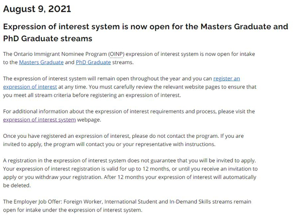 8月9日,安省硕士和博士移民项目 OINP Masters Graduate and PhD Graduate Streams 正式开放EOI申请通道。