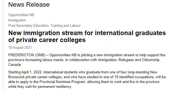 8月18日,新不伦瑞克省推出了一项新的移民试点项目:自202241日起,毕业于NB4所私立职业学院的19个指定专业的国际留学生,无需工作可以直接申请NB省提名移民!